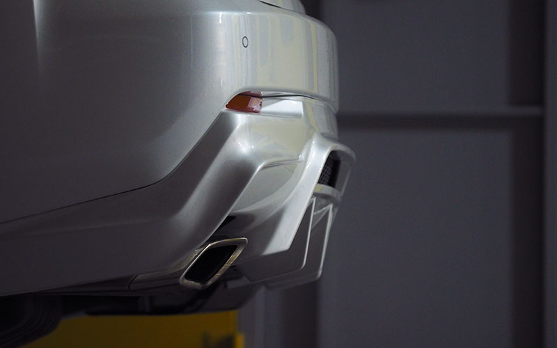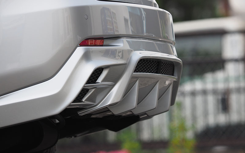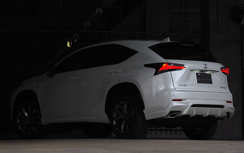 ■フロントフェイスのデザインからサイドのプレスラインなど、もともと純正のデザインから考えると純正リアアンダーは不釣り合いと感じデザイン変更としています。あまり格好良いとは言えない純正リアアンダーをフロントからサイド、リアへ違和感なく全体としてまとまりのあるNX200tとする目的で開発しました。迫力のあるディフューザーは必須と考え、純正マフラーを生かすデザインとするために、純正リアアンダーよりも張り出すライン取りをし、左右の張り出しとの繋がりを違和感なくバランスの良い角度としています。さらに、ディフューザーの本数から形状まで全体的なバランスを考え配置し、すべてのプレスラインが意味のあるラインとなるよう配慮しており、車全体のイメージとしてフロント・サイドに負けないレクサスらしいデザインとしました。
