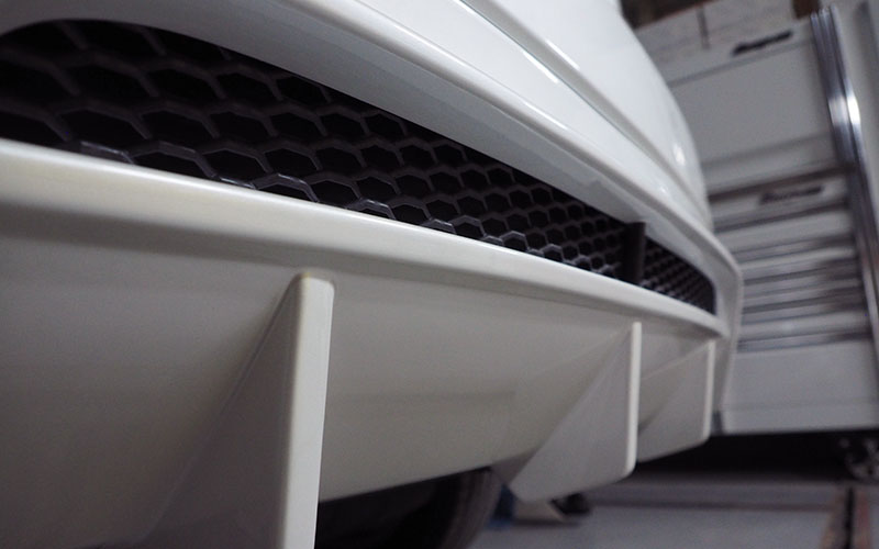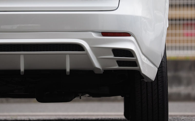 *取り付けに関して 純正リアアンダースポイラーと交換となり、固定にて穴あけ加工でボルト・ナット固定となります(装着してしまえば見えない部分に穴を開けます)。また、クリアランスが少ないために、リフレクターを削る加工が必要です(こちらも装着してしまえば見えない部分を加工します)。純正に戻す事も可能です