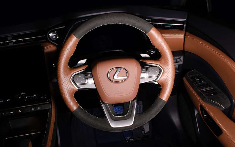 材料となるレザーは本革を純正カラーに合わせて染めて作っており、「サドルタン」「ブラック」とインテリアカラー全てのご用意があります。(ブラックに関しては既存の材料で染めていません)