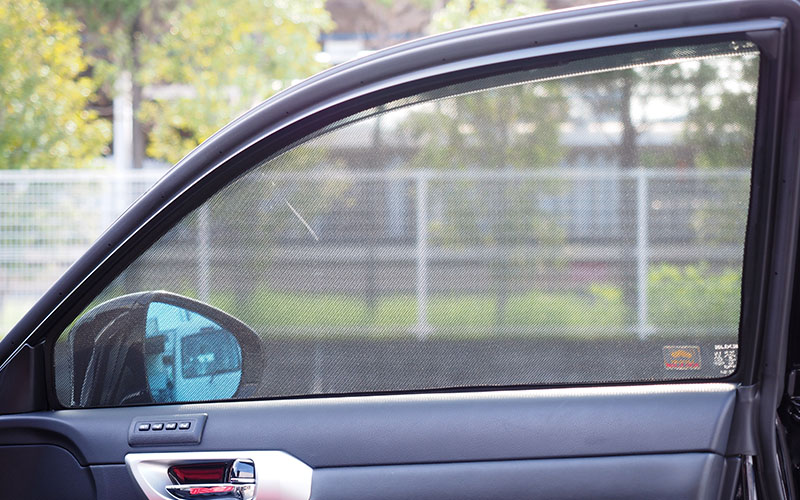 車種専用のサンシェードとなります。フロントガラス以外の5枚セット(運転席・助手席・後部座席左右・リアウインドウ)となっており、工具を使わず脱着が簡単で窓枠にぴったりなサンシェードです。内側からは見やすく外側からは見えにくい事により駐車中の防犯にもなりますし、紫外線を60%カットする事により室内温度上昇の防止にもなります。また、装着したままウインドウの開閉が可能ですので、オートキャンプやパーキングでの休憩時など窓を開けたままでも虫の侵入など防げる事により非常に便利です。