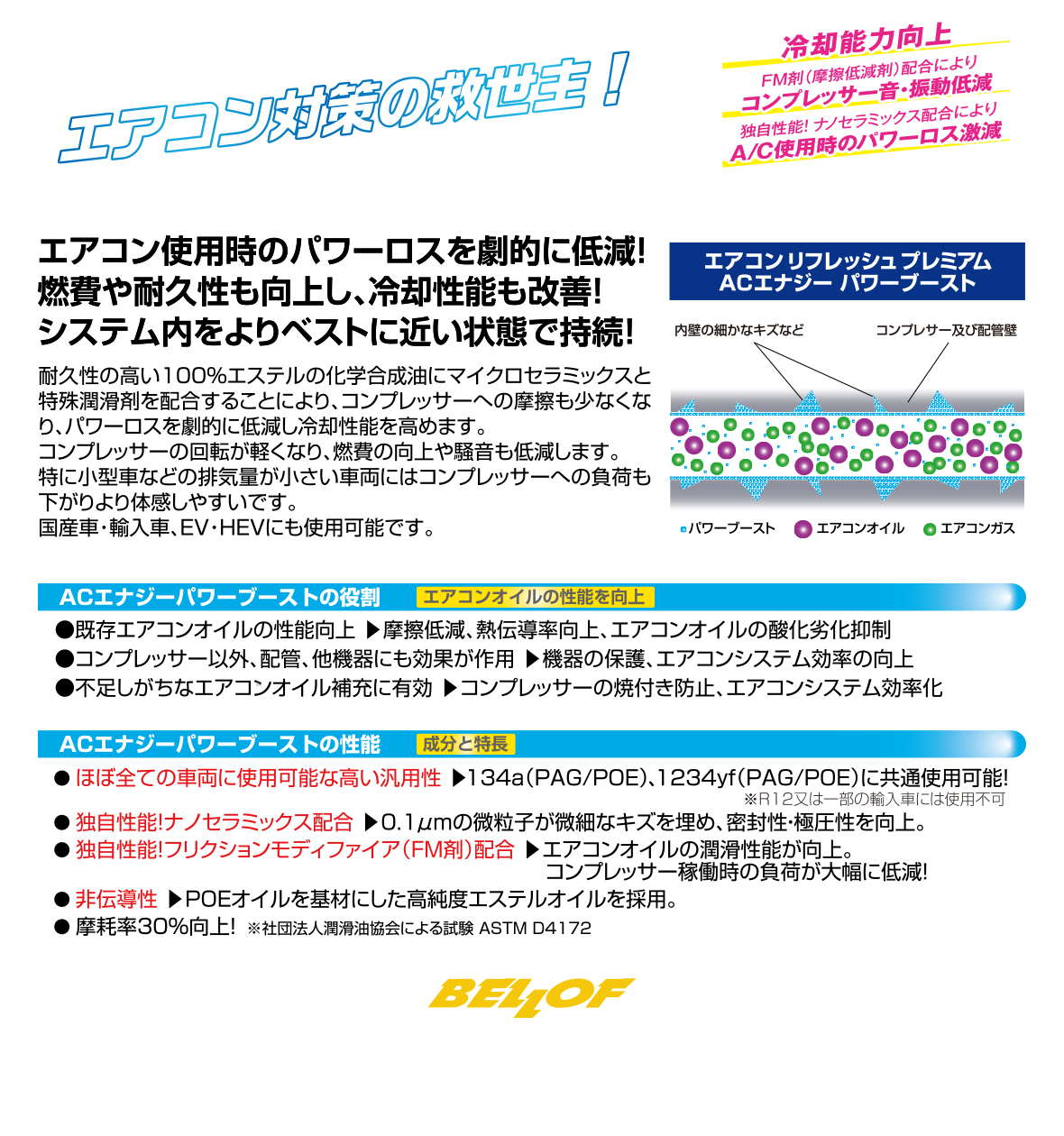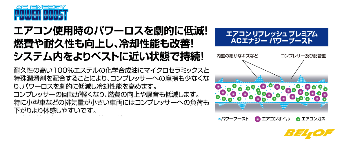 新車時から施工する事により、コンプレッサー及び配管壁へコーティングとなり摩擦低減からエアコン能力を最大限に、余計な負担が無い事から長期に渡りベストな状態を維持できます。定番のエアコンシステムを施工しエアコンガスを規定量に充填してから、パワーブーストを添加剤注入してコーティングをお勧めします。