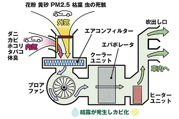 カーエアコンの部品の中で気温差が働き空気中の水分が水滴となり落ちてきます。この水滴が夏場は定期的に排出されますが、冬場になるとエアコンの使用頻度も少なくなりエバポレーター表面に水滴が残りそのままの状態で翌年の春を迎える頃には水滴がカビ化しております。