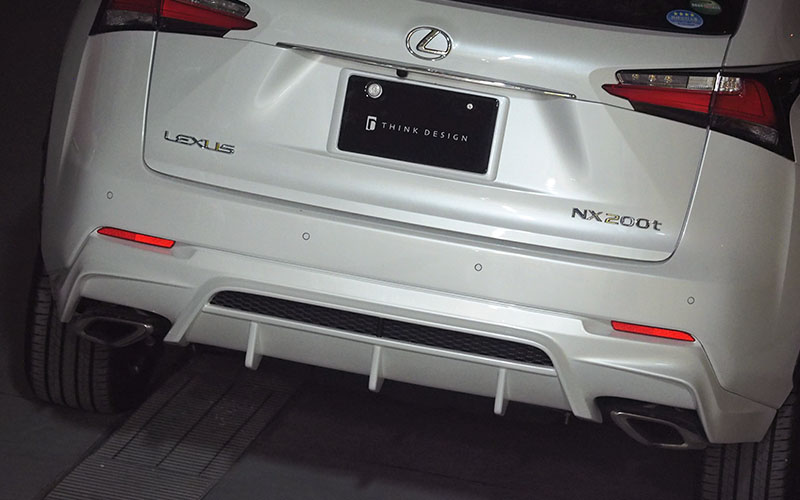 注意事項:もともとNX300h用の純正リアアンダーから型取りを行いNX200tと同じデザインにしようと試みたのですが、ディフューザー部分のラインがうまく取れないことからNX200tのリアアンダーをベースに製品化しております。それにより、ディフューザー下に付く純正アンダーカバーをNX200tのものを流用する事になります。その純正部品が¥4,526 (2015/8現在) となり製品代とは別に別途必要になります。NX200t用のアンダーカバーを使う事によりデザイン良くなる事からですので、ご理解頂けると幸いです。