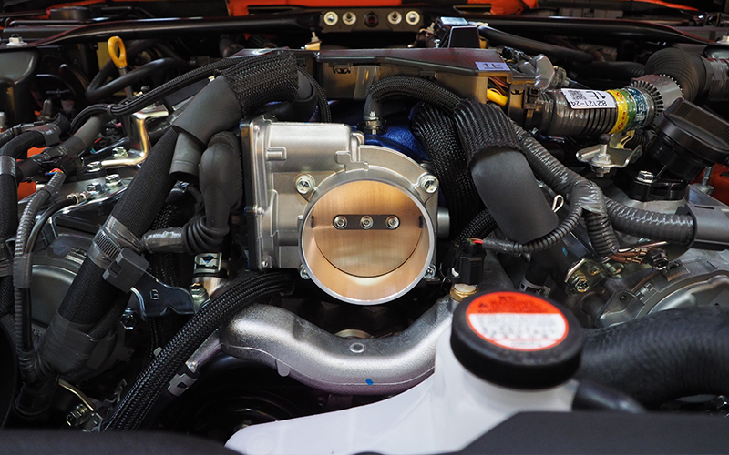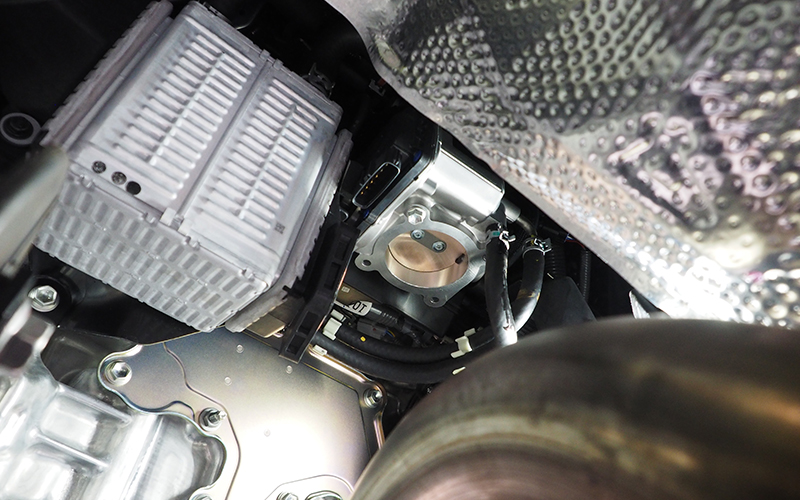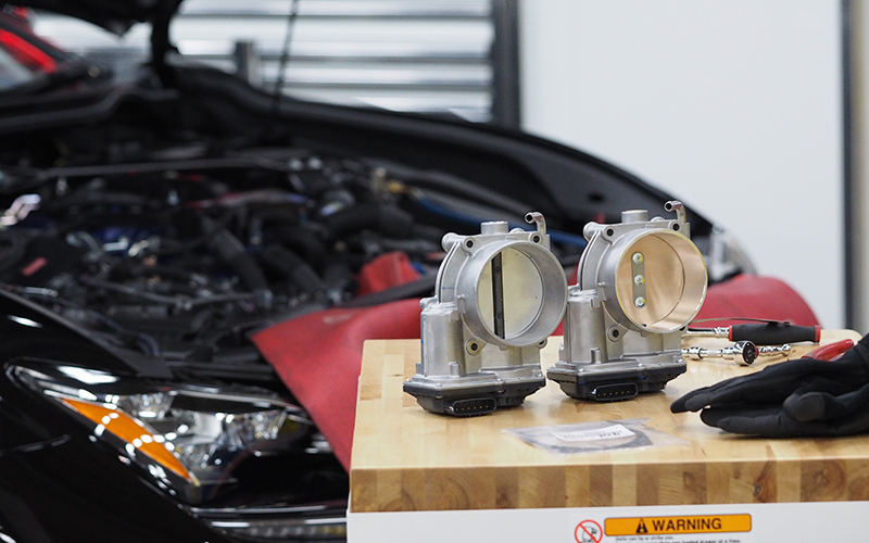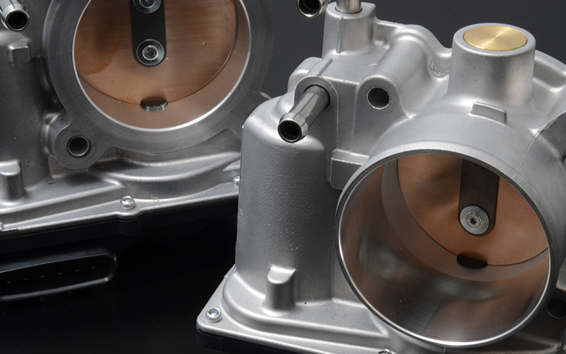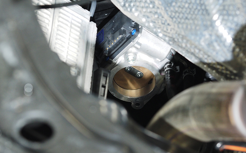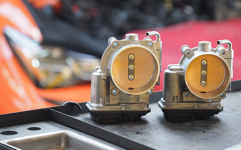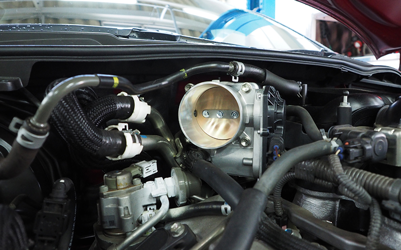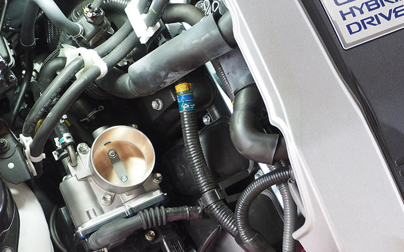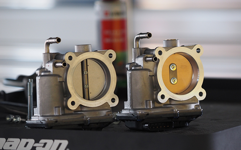 加工精度が要求される電子制御式スロットル用のビックスロットル。(レクサス車は1弁式スロットルを採用している為、高い加工精度が要求されます。) スロットルボディはエアクリーナーから取り入れた空気をアクセル開度に合わせて調整する重要なパーツです。機械加工によりスロットルボディの径を拡大、バタフライを新設し、純正と比べてスロットル径を約2mm拡大し、吸入面積を約5%〜10%アップしています。スロットル内径の拡大、またスロットル内面の研磨加工(段付き解消)をし、真鍮製大径バタフライを新設し、吸気径自体を拡大していますので、エンジン回転数全域でトルクアップを体感出来ます。