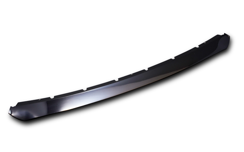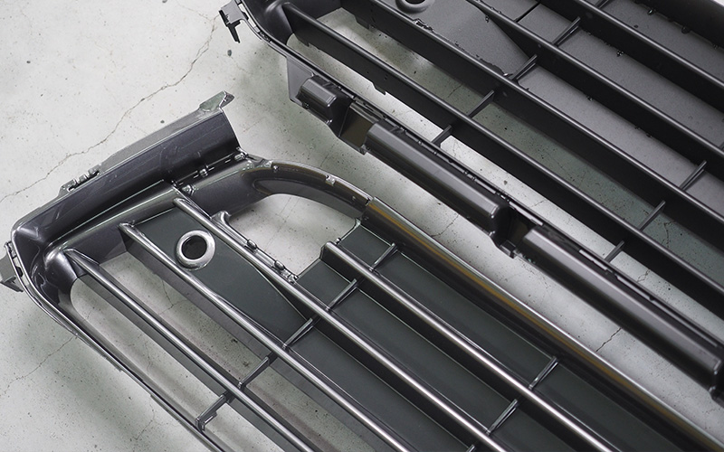 さらに、フロントグリルのライセンスプレート裏になる「バンパーエクステンション」をグリルガンメタ同色化にした製品もございます。このバンパーエクステンションはもともと塗装されていない樹脂のままでして、グリルガンメタにて同色化する事によりグリル全体が引き立ちます。加工の内容ですが、純正部品(¥11,016/2016,11月現在)をグリルガンメタに塗装してからが問題なのですが、部分的に貫通していない壁が多数ありまして、その壁が艶ありになると目立ちすぎることから、壁と同寸法の艶消し黒ステッカー(ブラックアウトフィルム)(¥8,100)にて処理します。横フィンの先端が上から下まで艶ありで統一され、奥にある縦リブも強調される事により、グリルそのものの奥行きも増してインパクトが強くなります。ただ、加工するに問題点もありまして、形状が複雑な事により塗装がかなり難しいです。