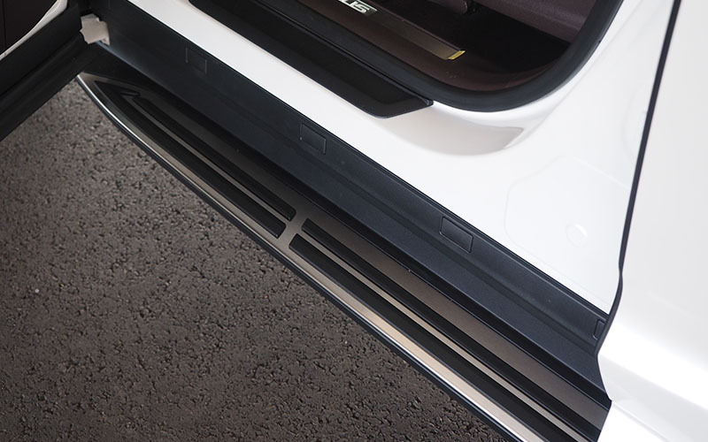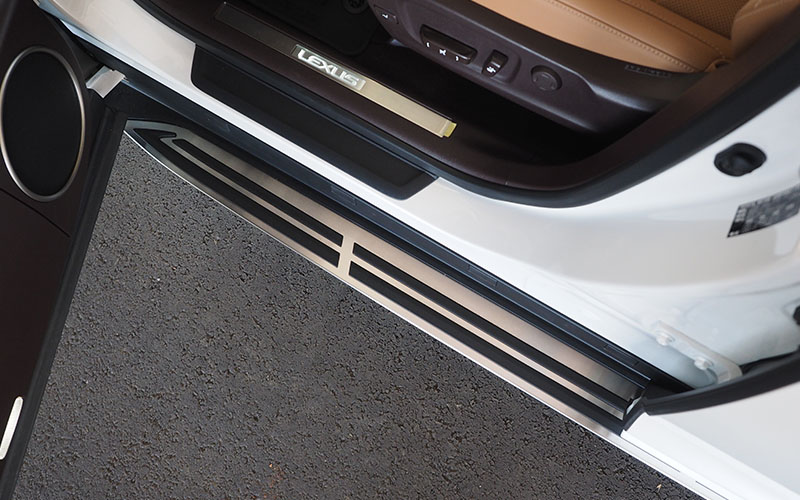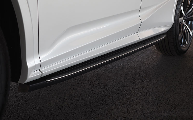 LEXUS RX200t/RX450h全車装着可能なランニングボードとなります。レクサス NXと比べるとフロアの高さが高いために乗り降りしにくいという欠点から採用したのですが、エクステリアパーツとしてファッション性にも優れています。純正サイドステップを同色にして見飽きてくると、もう一つワンポイントが欲しいと感じていたのですが、ランニングボードのシルバーラインが際立ちアクセントとなります。主張し過ぎないデザインである事から全体のバランスとしてマッチしています。もちろん、実用性は間違いなく、女性の方やお子様が乗り降りする時に重宝します。フロアマットまで違和感なく1歩目を出せる身長の方であれば良いのですが、届かない方はスカッフプレートに直接乗る事が多いかと思います。スカッフプレートは室内ですので、汚れて見窄らしくなるのが気になる方に、ランニングボードであれば2歩目がフロアマットになりますので、室内が汚れる心配がありません。ランニングボードは室外ですから、洗車時に一緒に洗うことが可能です。実用性とファッションを兼ね揃えたランニングボードをご検討ください。