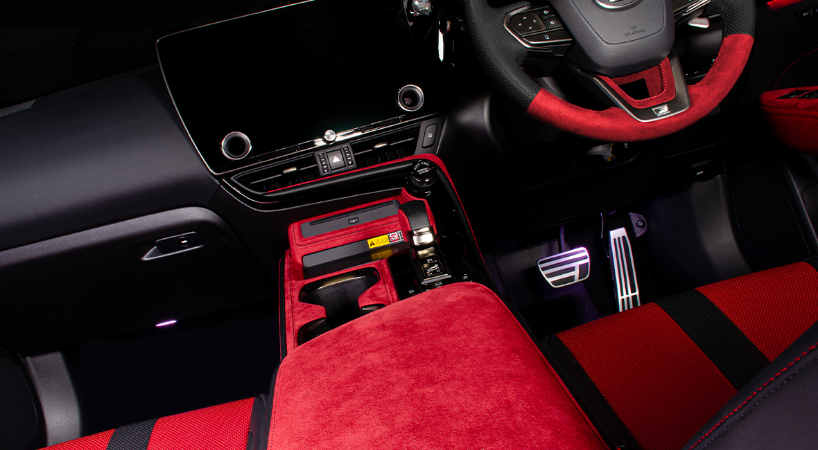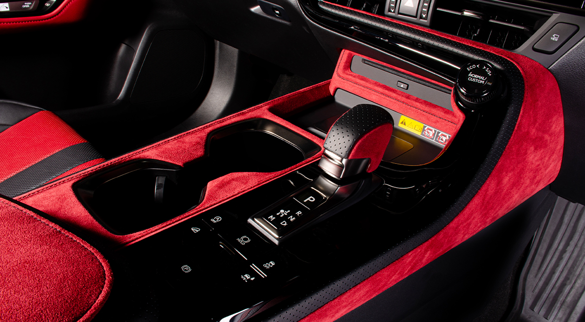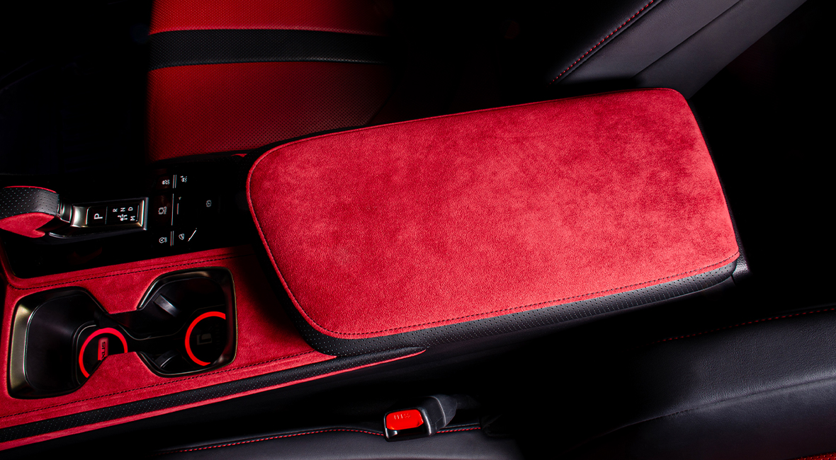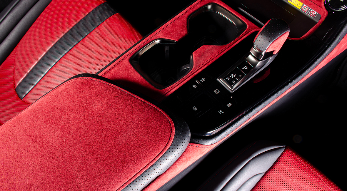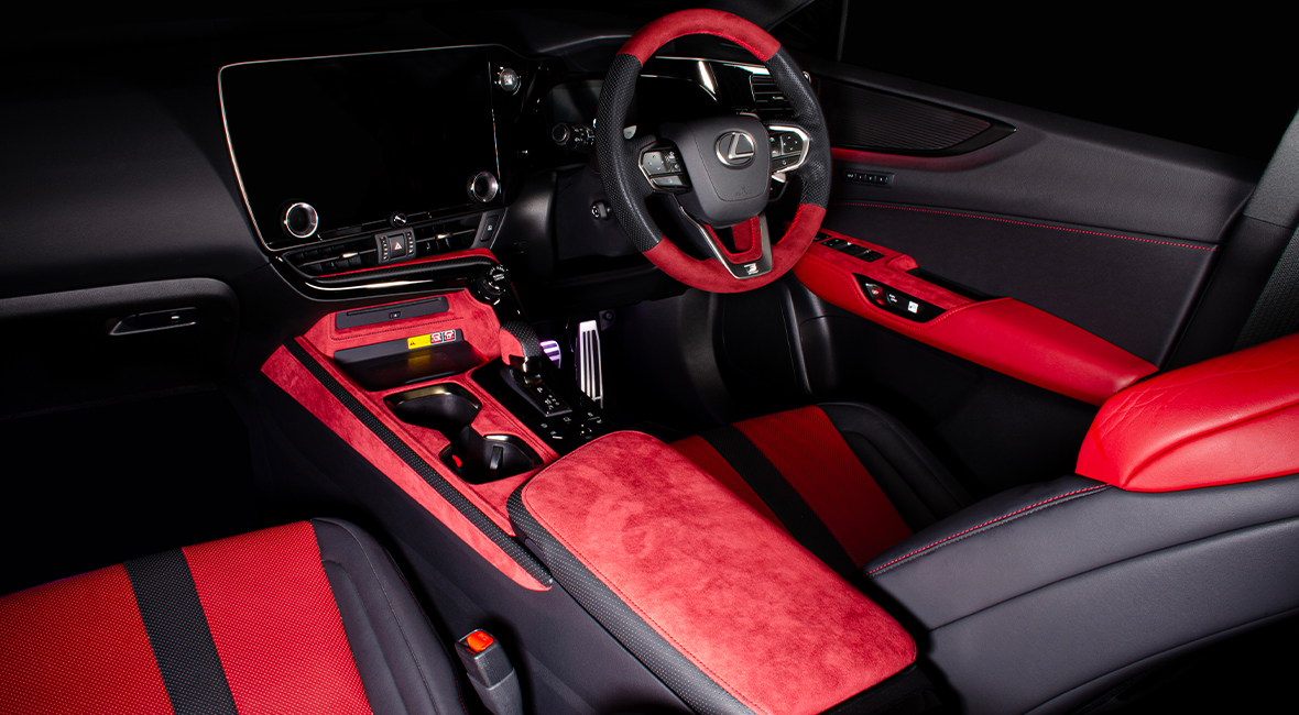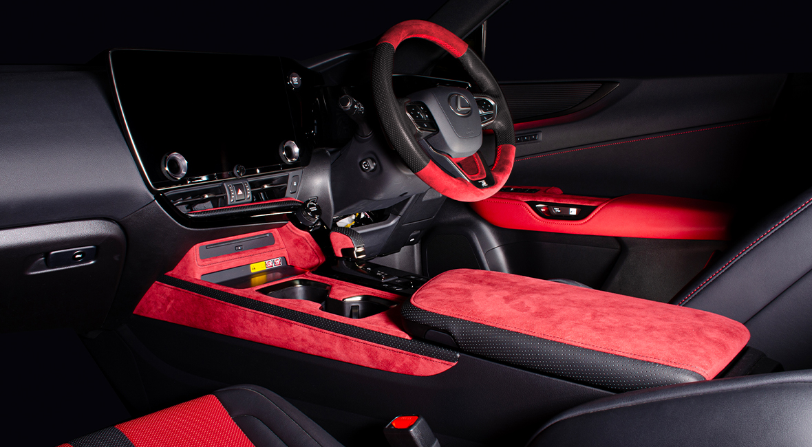大変ご好評を頂いております、LEXUS NX レザーインテリアに数量限定として"アルカンターラ レッド"を発売致します。通常ではブラックのみの設定ですが、特別にレッドをご用意させて頂きました。アルカンターラの素材感や感触は、皆様周知のこととは思いますが、そんなアルカンターラのレッド仕様は見た目にも特別な風合いを感じさせてくれるはずです。この機会に是非お買い求め下さい。