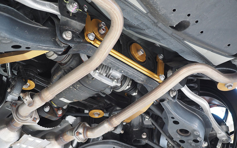 アーム類からサスペンションまで全ての足回りの土台となる「サスペンションメンバ」ですが、RCFやGSFでは純正で補強がされている事からヒントを得て製品化しています。