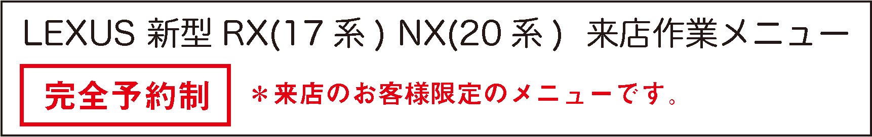 大好評! 新型RX / NXの来店専用メニュー。テレビキャンセラーやフットランプ、フォグランプをご紹介。定番のスナップオン エアコンシステムやブレーキホールドもご用意しております。*作業は全て完全予約制となっておりますので、ご予約の上、ご来店下さい。 ■ 詳細はクリック